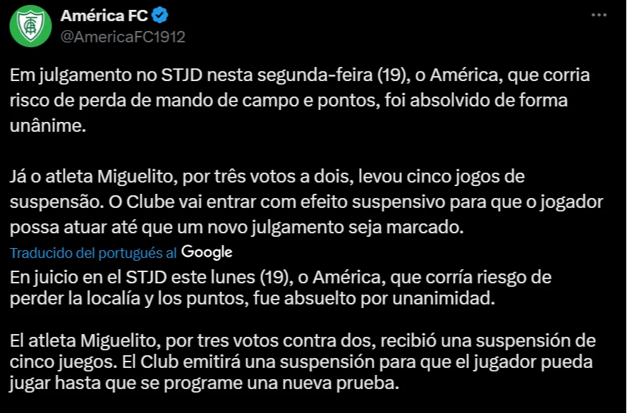 Aunque el árbitro no escuchó directamente los insultos, el protocolo antirracismo fue activado y se inició una investigación oficial. El tribunal decidió la sanción por una votación ajustada de tres contra dos, imponiendo además una multa económica al jugador. Por otro lado, el club América Mineiro fue absuelto por unanimidad de cualquier responsabilidad institucional.