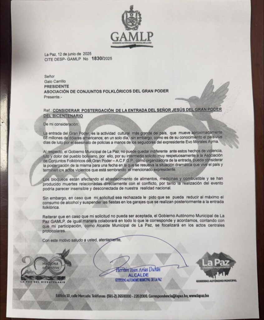 La Paz, 12 de junio de 2025 – Ante la grave situación que atraviesa el país, marcada por enfrentamientos violentos en Llallagua con cinco muertos confirmados, escasez de combustible y el aumento en el costo de la canasta familiar, el alcalde de La Paz, Iván Arias, solicitó a la Asociación de Conjuntos Folklóricos del Gran Poder considerar la postergación de la Festividad del Señor Jesús del Gran Poder del Bicentenario, prevista para este sábado 14 de junio.