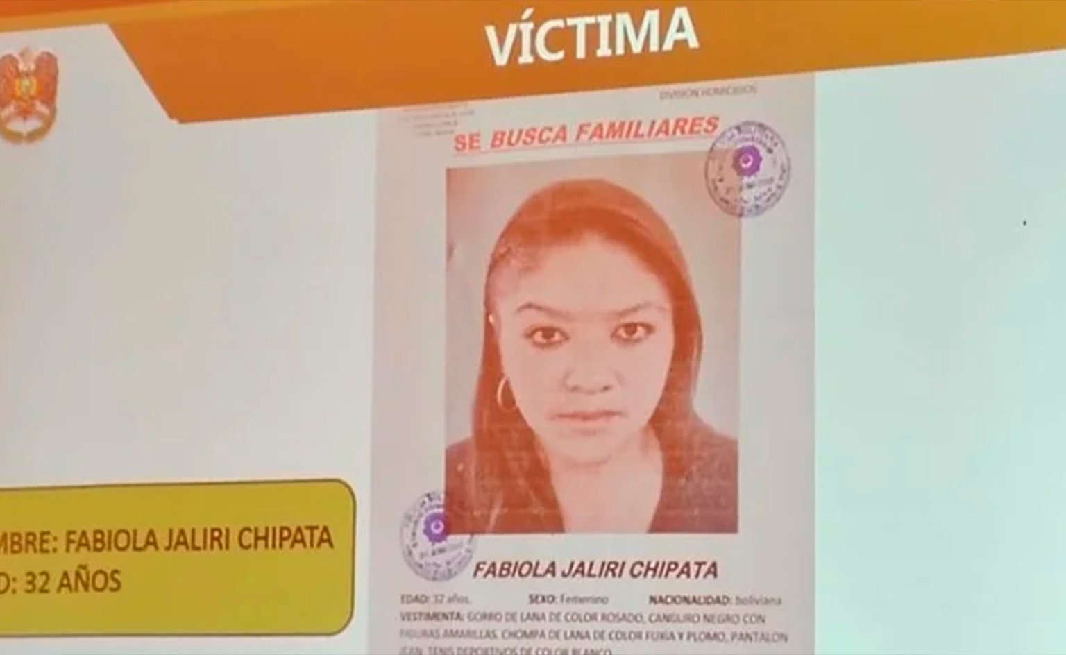 La Paz, 12 de junio 2025 .- La Policía Boliviana informó este miércoles que logró identificar a la mujer que fue hallada desmembrada en distintos puntos de la ciudad de La Paz. Se trata de Fabiola Jaliri Chipata, de 32 años, cuyos restos fueron encontrados en la zona Periférica en diferentes fechas.