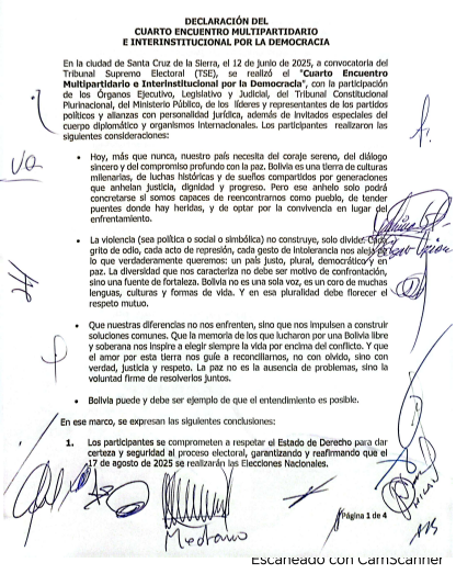 Bolivia, 13 de junio de 2025 – Ayer concluyó en Santa Cruz la IV Cumbre Multipartidaria por la Democracia, convocada por el Tribunal Supremo Electoral (TSE), con un llamado a que las diferencias políticas se transformen en soluciones comunes para garantizar la estabilidad democrática del país. El vocal del TSE, Gustavo Ávila, leyó las conclusiones del encuentro, en las que los participantes se comprometieron a respetar el estado de derecho y garantizar la realización de las elecciones nacionales el 17 de agosto de 2025.