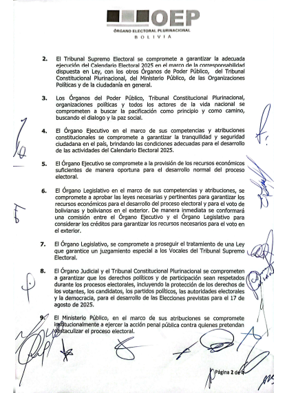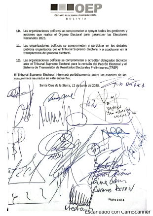 Sin embargo, el dato relevante de la jornada fue que Andrónico Rodríguez, presidente del Senado y dirigente cocalero, fue el único participante que no firmó el acta de compromiso para la realización de las elecciones en agosto. El resto de los actores políticos, representantes de los órganos del Estado y organizaciones participantes ratificaron su respaldo a la convocatoria electoral y a los compromisos asumidos.