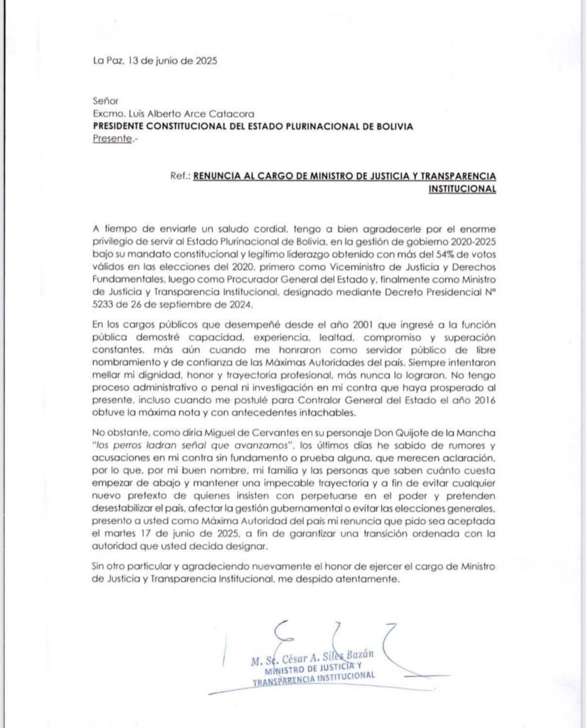 Bolivia, 14 de junio de 2025 – El ministro de Justicia y Transparencia Institucional, César Siles, presentó su renuncia al cargo, la cual será efectiva el martes 17 de junio de 2025, según informó en una carta dirigida al presidente del Estado Plurinacional de Bolivia. En su misiva, Siles agradece la oportunidad de haber servido al país durante la gestión gubernamental 2020-2025, destacando su trayectoria desde 2001 en diversos cargos públicos, incluyendo viceministro de Justicia y Procurador General del Estado.