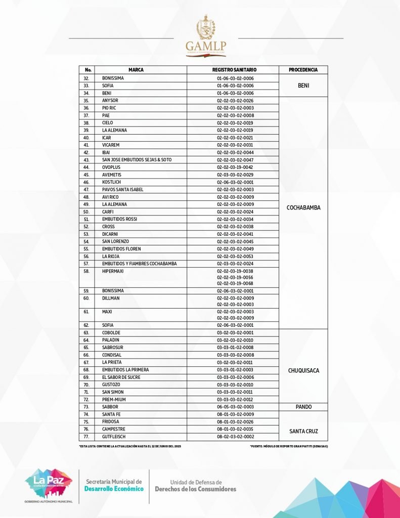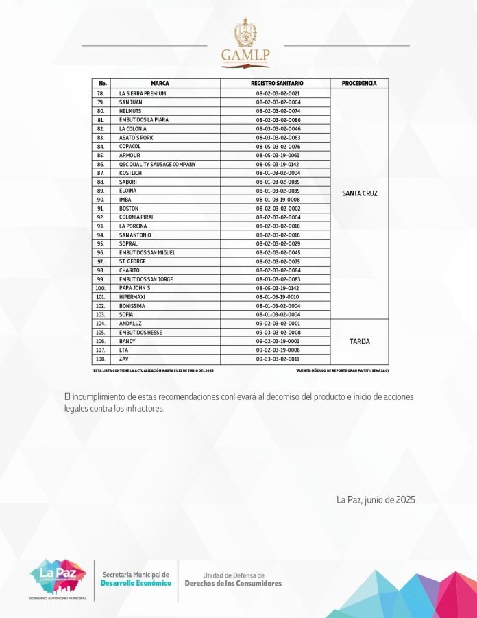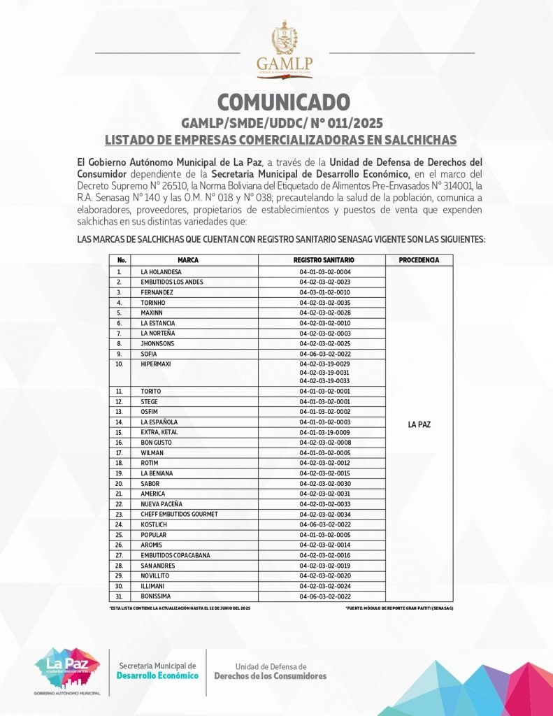 Bolivia, 17 de junio de 2025 – Con la proximidad de la festividad de San Juan, la Alcaldía de La Paz dio a conocer la lista oficial de 108 empresas autorizadas para comercializar embutidos, principalmente salchichas, en la ciudad. La jefa de la Unidad de Defensa de los Derechos del Usuario y Consumidor, Geraldine Ugarte, informó que se realizaron capacitaciones a los comerciantes mayoristas y minoristas sobre buenas prácticas de manipulación y que se intensificarán los controles durante la festividad.