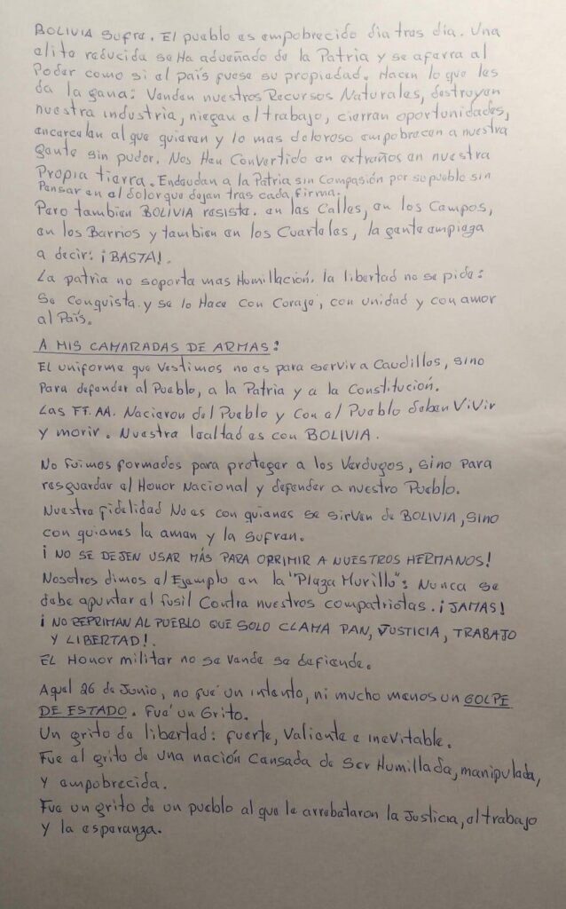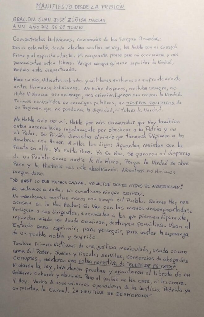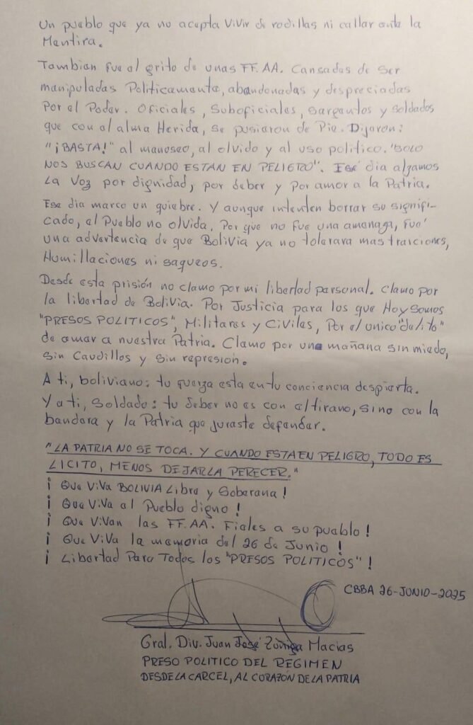 “Desde esta prisión no clamo por mi libertad personal. Clamo por la libertad de Bolivia. Por justicia para los que hoy somos presos políticos, militares, policías y civiles, por el único ‘delito’ de amar a nuestra patria.”