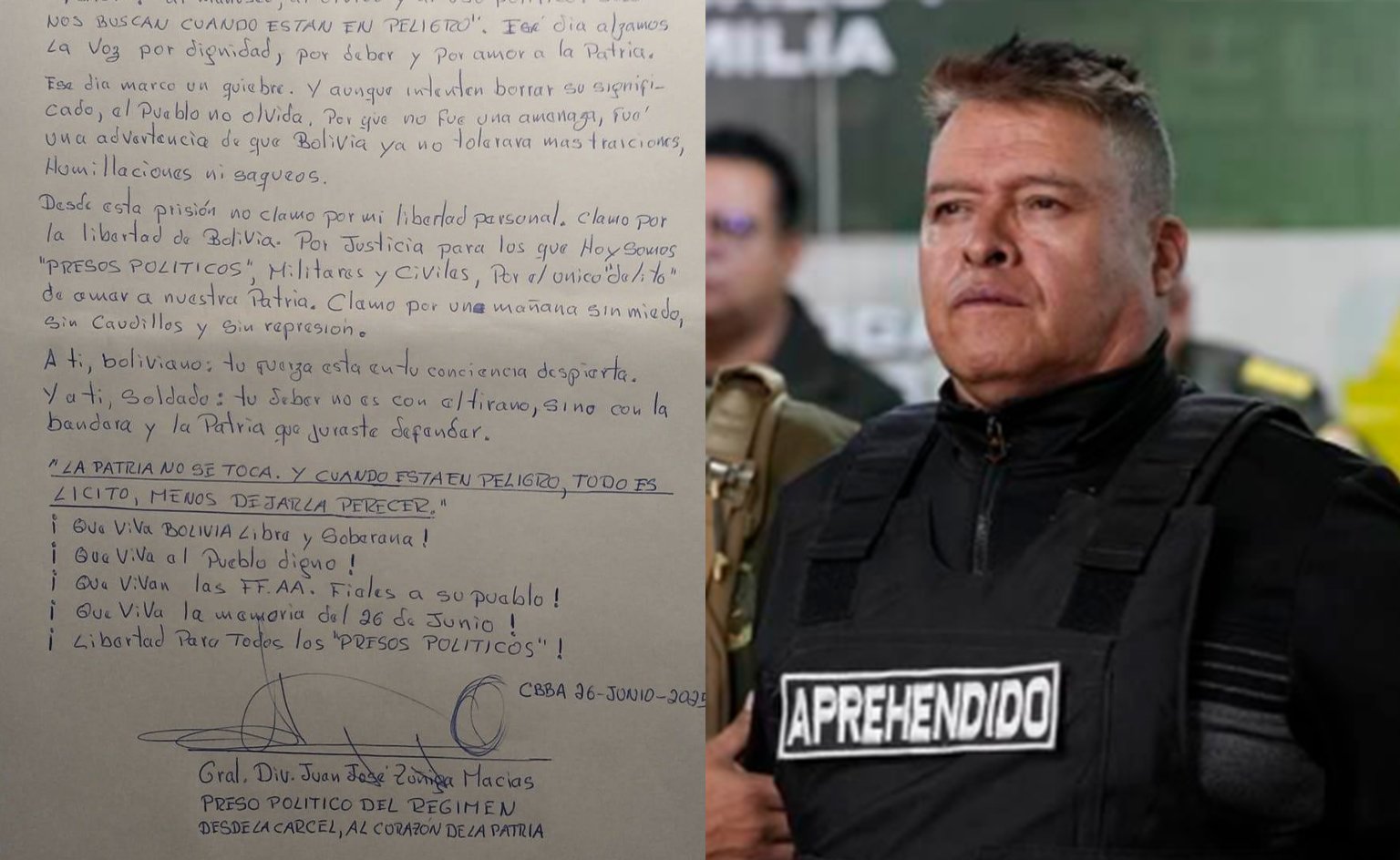 Bolivia, 26 de junio de 2025 – A un año de la toma militar de la plaza Murillo, el excomandante del Ejército, general Juan José Zúñiga, rompió el silencio desde la cárcel con un manifiesto dirigido a sus camaradas y al pueblo boliviano. Zúñiga, preso en El Abra (Cochabamba) y acusado de terrorismo por el movimiento militar del 26 de junio de 2024, reiteró que “no fue un golpe de Estado” y denunció la manipulación política de las Fuerzas Armadas y la criminalización de los militares involucrados.