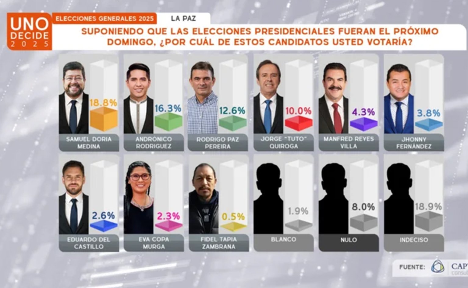 - La Paz: Samuel Doria Medina lidera con 18,8%, seguido de Andrónico Rodríguez (16,3%) y Rodrigo Paz (12,4%). Sin embargo, el 29% del electorado no tiene candidato definido: 18,9% son indecisos, 8% votarían nulo y 1,9% en blanco.