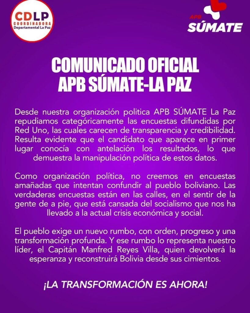 Cochabamba, 30 de junio de 2025 – La Coordinadora Departamental de La Paz de la organización política APB Súmate, que respalda la candidatura de Manfred Reyes Villa, emitió un comunicado oficial repudiando “categóricamente” los resultados de la encuesta difundida por Red Uno. Según el pronunciamiento, la encuesta “carece de transparencia y credibilidad” y habría sido manipulada políticamente.