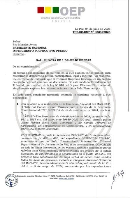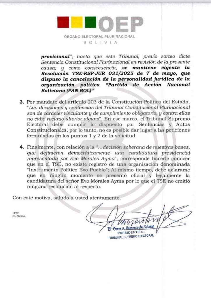 Bolivia, 8 de julio de 2025 – El presidente interino del Tribunal Supremo Electoral (TSE), Óscar Hassenteufel, envió una carta formal al expresidente Evo Morales en respuesta a su solicitud del 1 de julio, en la que le confirma que no podrá postularse como candidato en las elecciones presidenciales de 2025.