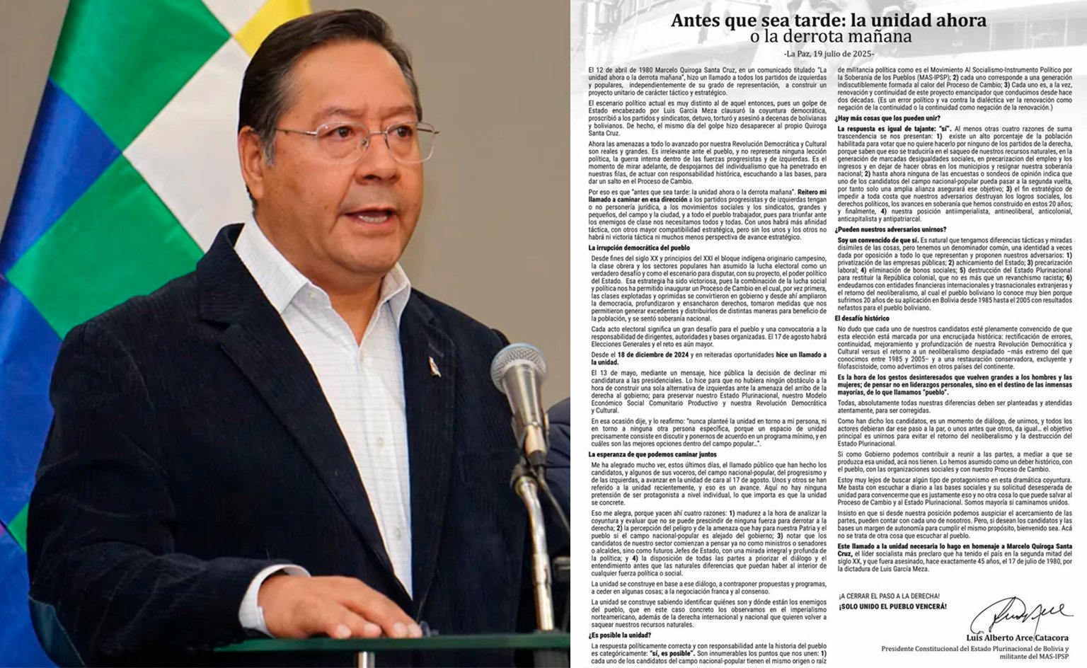 La Paz, 20 de julio 2025 .- El presidente del Estado, Luis Arce, hizo este domingo un llamado público a los sectores progresistas y de izquierda del país para consolidar la unidad política rumbo a las elecciones generales del 17 de agosto. En una carta titulada “Antes que sea tarde: la unidad ahora o la derrota mañana”, el mandatario advirtió sobre los riesgos de fragmentación del voto popular y alertó que los partidos de derecha apuntan a revertir los avances logrados desde 2006.