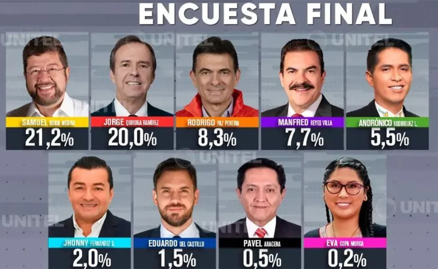 En las últimas encuestas difundidas por medios privados como Unitel, Red Uno y Cadena A, el candidato Rodrigo Paz Pereira aparecía en tercer lugar con apenas 8.3% de intención de voto, muy lejos de lo finalmente expresado en las urnas.