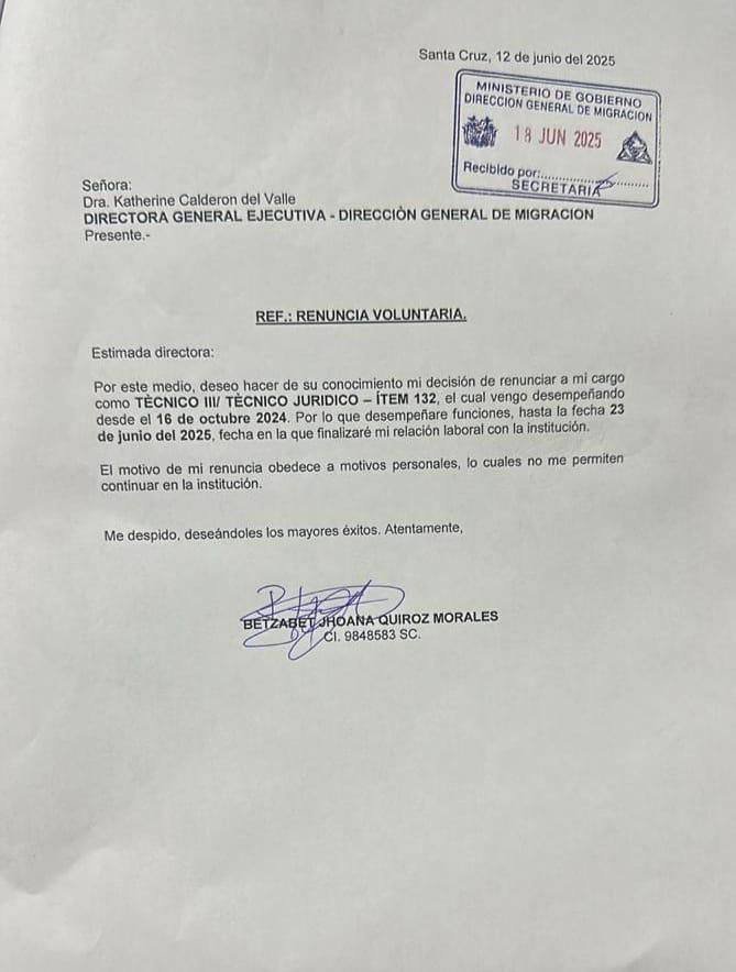 Quiroz Morales, hija del concejal del MAS José Quiroz y ex Técnico Jurídico en la Dirección General de Migración, presentó su renuncia apenas el 12 de junio de 2025, teniendo su último día laboral el 20 de junio, incumpliendo el plazo exigido para candidaturas.