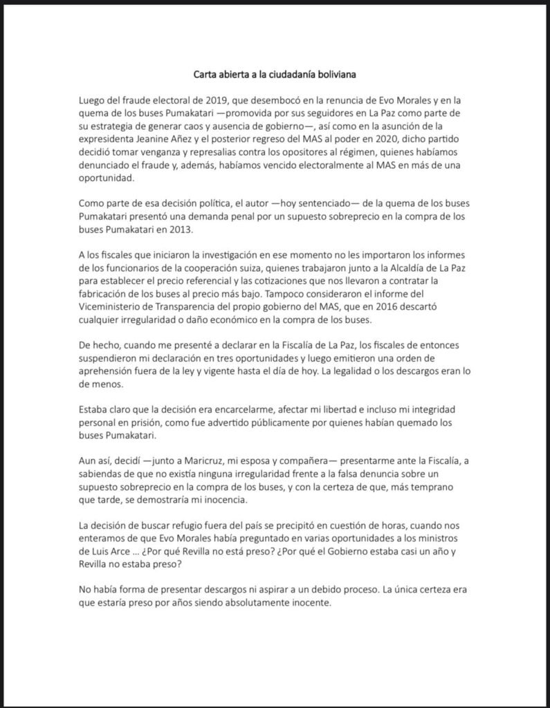 Revilla afirma que el MAS promovió “venganza y represalias” contra los opositores que denunciaron el fraude y lograron derrotarlos en las urnas. Según el exalcalde, la persecución judicial se basa en una denuncia por un supuesto sobreprecio en la compra de buses Pumakatari en 2013, denuncia que califica de “falsa” y sin sustento, señalando que informes técnicos y del Viceministerio de Transparencia descartaron irregularidades.