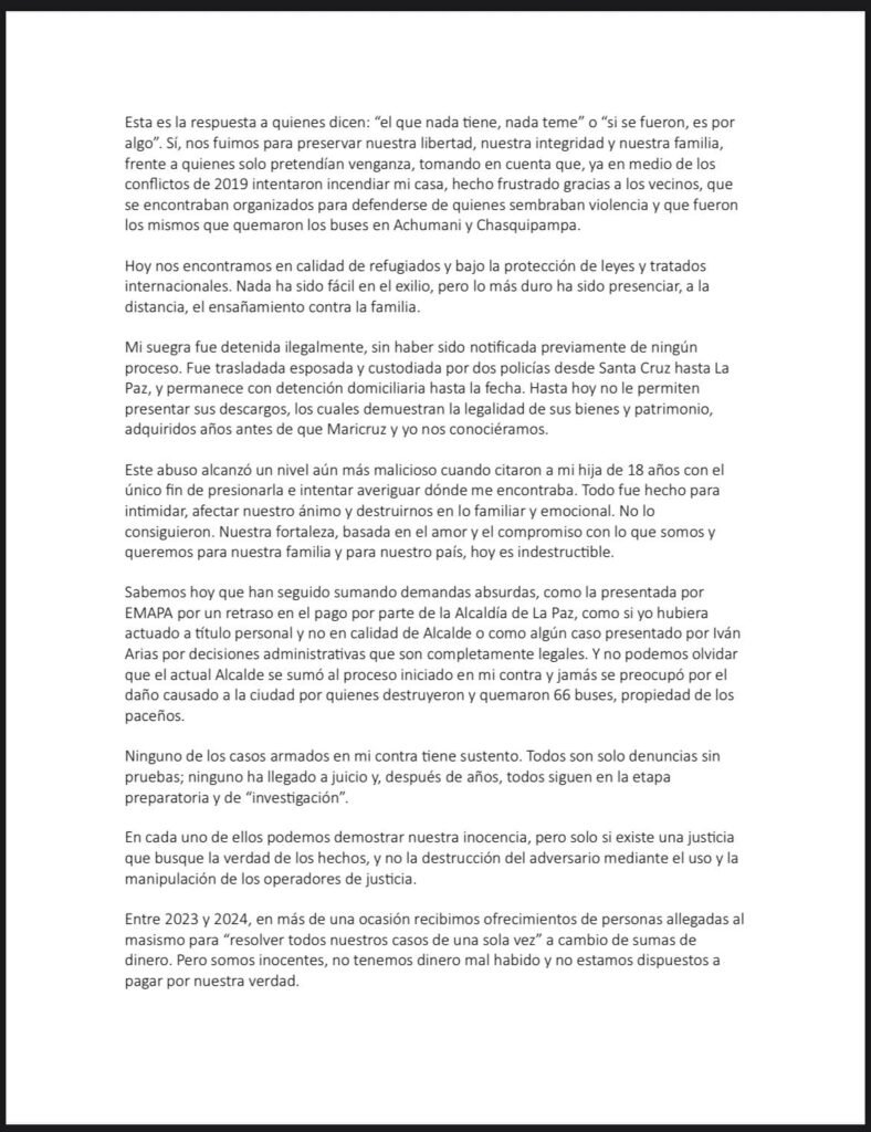 Finalmente, rechazó las ofrecimientos de sobornos para resolver las causas judiciales, reafirmando su inocencia y el compromiso de buscar justicia verdadera. “Quiero volver al país junto a mi familia, con mis derechos constitucionales plenamente garantizados”, concluyó.