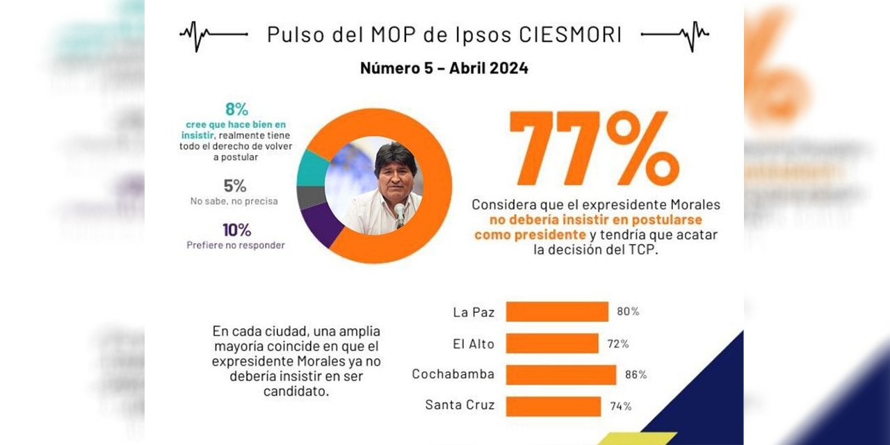 En una encuesta de Ipsos Ciesmori, el 77% considera que Evo Morales no debería insistir en postularse nuevamente para las elecciones presidenciales de 2025. Los encuestados opinan que Morales debe acatar el fallo del Tribunal Constitucional Plurinacional (TCP), que establece que la reelección indefinida no es un derecho humano.