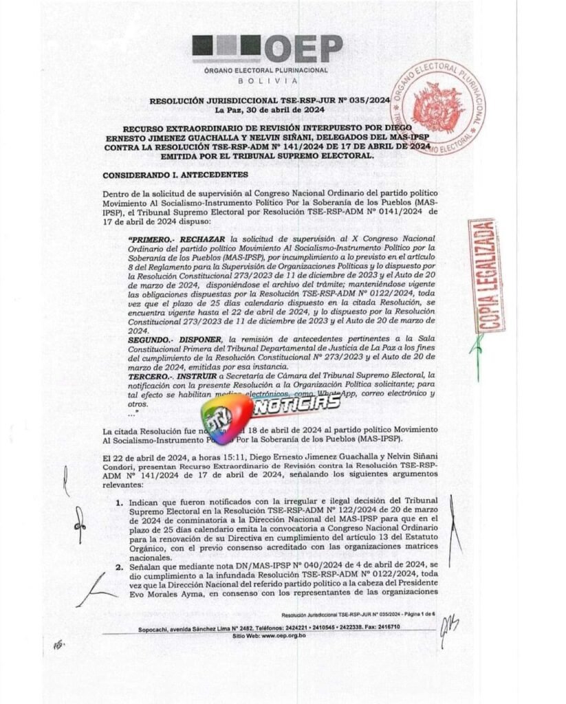 Asimismo, el TSE también desestimó el recurso extraordinario presentado por la dirección nacional del MAS, que buscaba la habilitación del acompañamiento en el congreso de Villa Tunari. La decisión del órgano electoral se mantiene firme en rechazar el acompañamiento solicitado y en no recibir al MAS en audiencia.