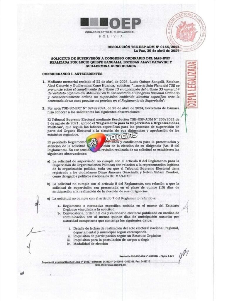 De esta manera, el TSE ha establecido que no se llevará a cabo ningún acompañamiento por parte del órgano electoral en los congresos del MAS en El Alto y Villa Tunari.