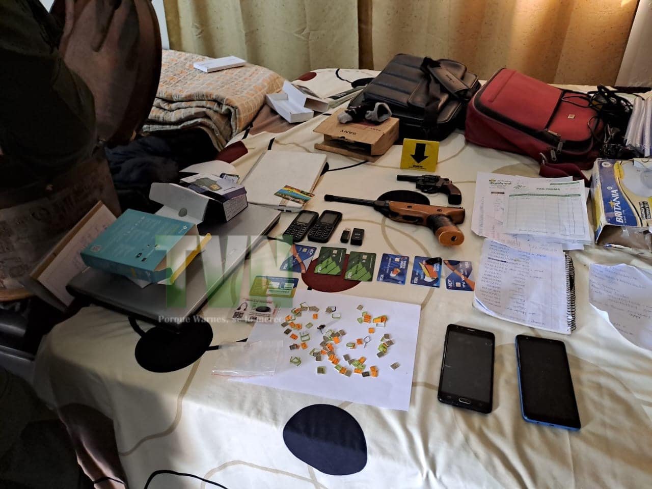 En el allanamiento, dos hombres y una mujer fueron aprehendidos. “Siguiendo las denuncias de diferentes víctimas se ha hecho un seguimiento a través de Cibercrimen y el trabajo de Inteligencia del DACI nos ha permitido ubicar un domicilio en Villa Primero de Mayo. Hemos encontrado un centro de operaciones o granjas donde se manejan una serie de artefactos electrónicos”, informó el comandante departamental de la Policía de Santa Cruz, coronel Erick Holguín, a la red Unitel. Durante la intervención, se incautaron cuatro celulares, dos laptops y más de 100 chips de diferentes empresas de telefonía celular.