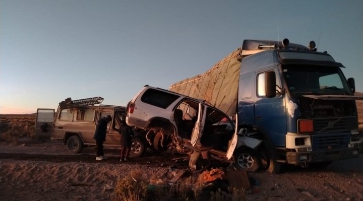 Oruro, 27 de junio de 2024 – La madrugada de este jueves, un trágico accidente se produjo en el camino de tierra entre Sabaya y la población de Cahuana, en el departamento de Oruro, cuando una vagoneta Toyota Runner intentó huir de un control operativo aduanero. A pesar de que lanzaron miguelitos a la carretera, no lograron despistar a los uniformados y chocaron de frente con un camión estacionado que presuntamente transportaba mercadería de contrabando.