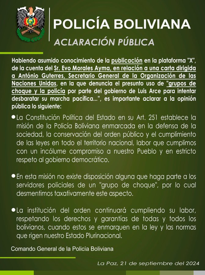 Bolivia, 22 de septiembre de 2024 – El Comando General de la Policía Boliviana emitió un pronunciamiento oficial en respuesta a las declaraciones realizadas por Evo Morales en la plataforma X, donde el expresidente acusaba al gobierno de Luis Arce de utilizar «grupos de choque y la policía» para desbaratar su marcha política.