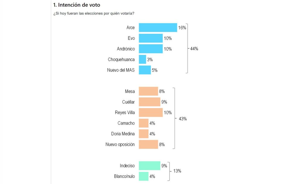 “El 2025 este empate será definido por los indecisos, aproximadamente el 15% del padrón electoral. Están sobre todo en los estratos superiores de la clase baja que se beneficiaron de la estabilidad económica durante los gobiernos de Evo y que, hasta el 2014 votaron por el MAS”, señala una de las conclusiones de la encuesta.