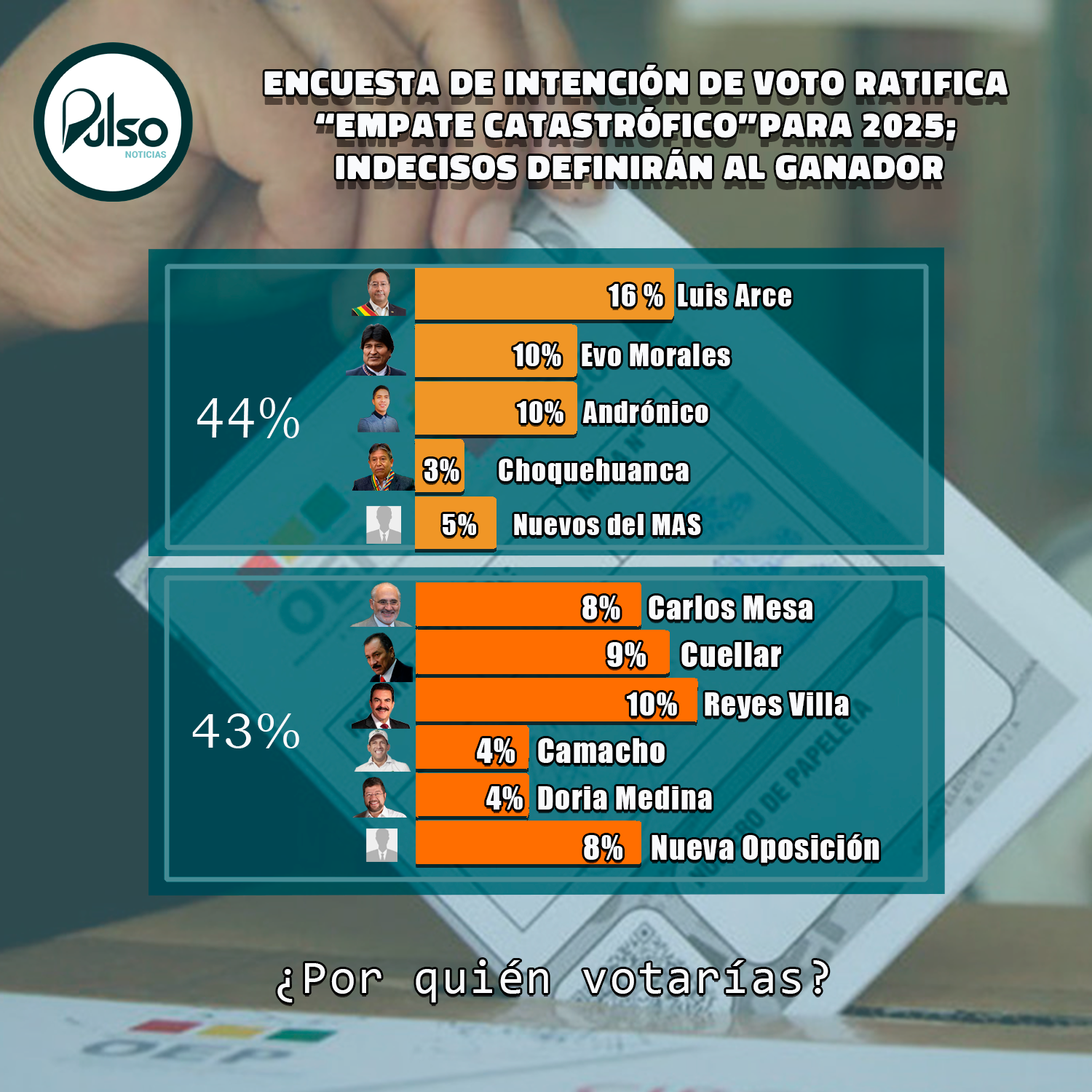 Bolivia, 2 de octubre de 2024 – Una reciente encuesta de intención de voto de la empresa Diagnosis ratificó la existencia de un “empate catastrófico” y polarización electoral para 2025. El estudio advierte que los indecisos definirán quién ganará los comicios.