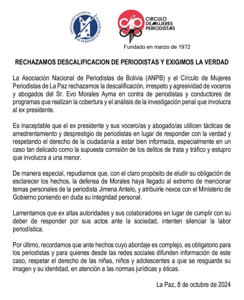 Bolivia, 8 de octubre de 2024 – La Asociación Nacional de Periodistas de Bolivia (ANPB), junto con el Círculo de Mujeres Periodistas de La Paz, ha expresado su firme rechazo a la descalificación y agresividad mostrada por los voceros y abogados del ex presidente Evo Morales Ayma hacia los periodistas que investigan las acusaciones de trata y estupro en su contra.