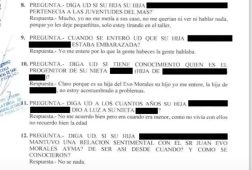 El hombre de 67 años contemporáneo de Morales, en su declaración de 58 preguntas, confirmó que su nieta hija de la supuesta víctima de estupro es hija de Evo Morales, las preguntas 10, 11 y 51 son contundentes al señalar que la menor en esa época era miembro de la Guardia Juvenil Presidencial en Tarija, y que tuvo a su hija a los 15 años.