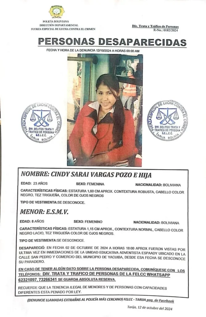 Bolivia, 16 de octubre de 2024 – La Policía Nacional de Bolivia ha difundido un afiche de búsqueda de C.S.V.P., una joven de 23 años, y su hija de ocho años, en el marco de la investigación por trata y tráfico que involucra al expresidente Evo Morales. La denuncia por la desaparición de ambas se presentó tras su última aparición el 2 de octubre, alrededor de las 18:00, en las cercanías de una unidad educativa en el municipio de Yacuiba, Tarija.