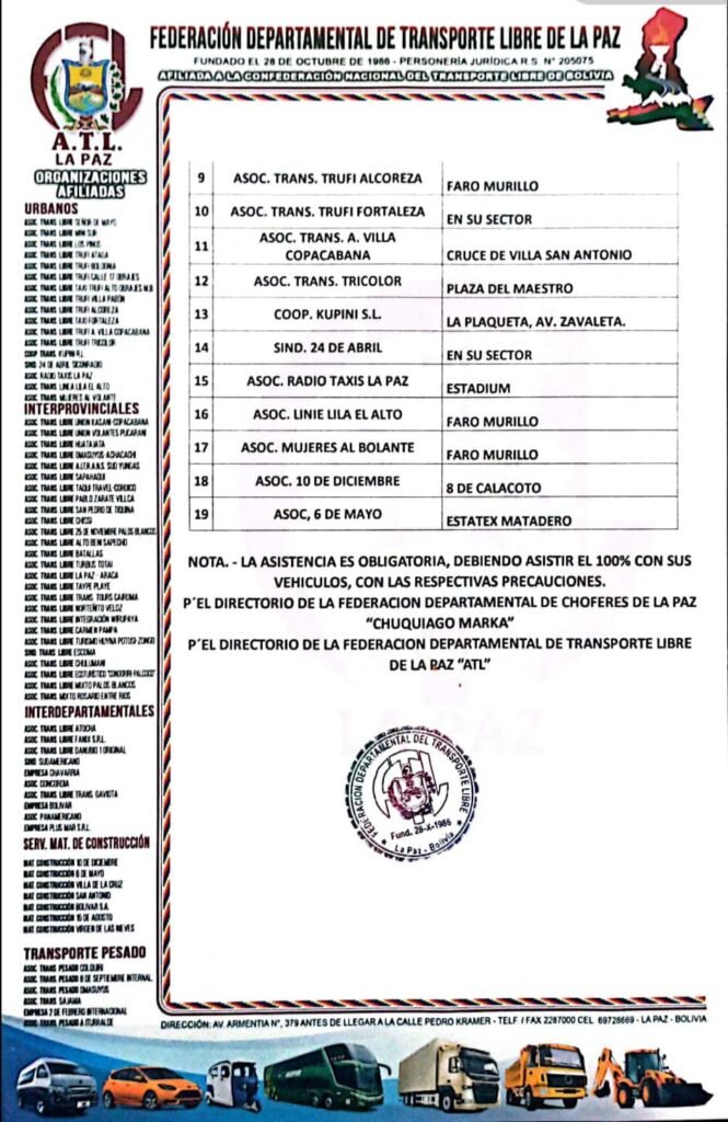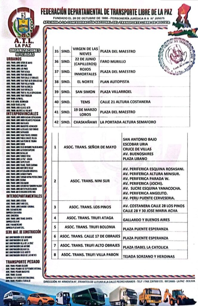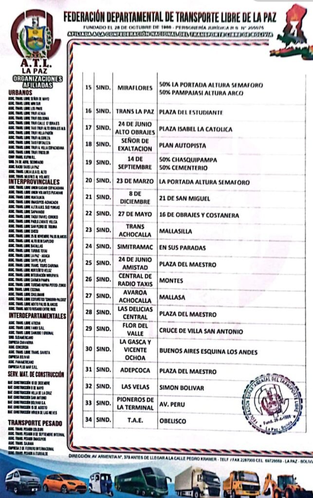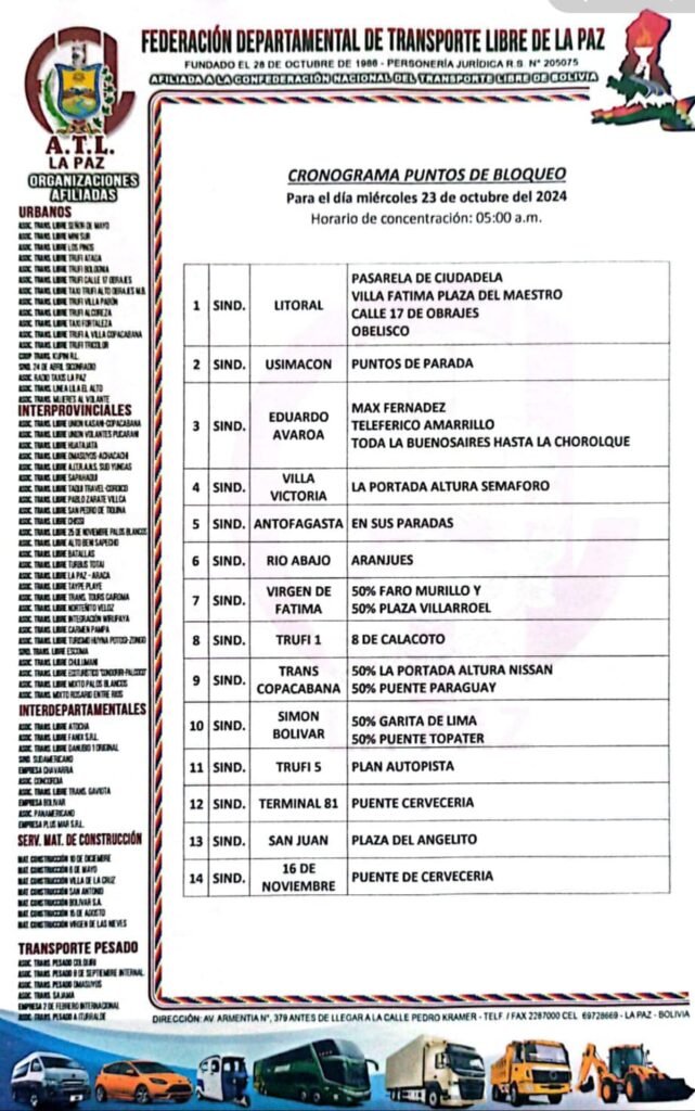 La Paz, 22 de octubre de 2024 – Más de 60 sindicatos de transporte de la ciudad de La Paz se alistan para el denominado «Bloqueo de Mil Esquinas», una medida de presión que afectará distintos puntos de la ciudad este miércoles 23 de octubre. La Federación de Chuquiago Marka y Transporte Libre de La Paz lideran esta protesta, que busca exigir el abastecimiento de combustible y la regulación de la canasta familiar.
