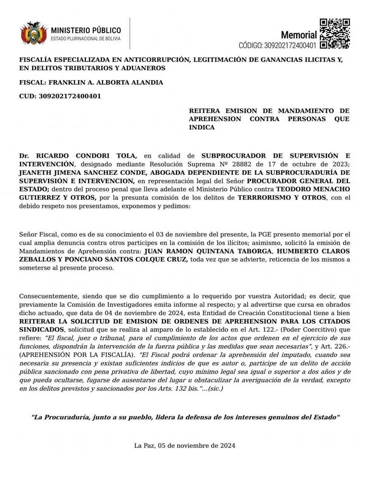 La Paz, 6 de noviembre de 2024 – La Procuraduría General del Estado en Bolivia solicitó nuevamente a la Fiscalía emitir una orden de aprehensión contra los dirigentes del Estado Mayor del Pueblo, Humberto Claros y Ponciano Quispe, así como contra el exministro de la Presidencia Juan Ramón Quintana, acusándolos de terrorismo y otros delitos. La solicitud surge en el contexto de bloqueos que duraron 19 días y fueron organizados por la Confederación Sindical Única de Trabajadores Campesinos de Bolivia (CSUTCB), en reclamo de medidas para enfrentar la crisis económica, el alza en precios de productos y la escasez de combustible.