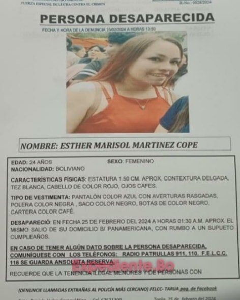 Esther Marisol peleó hasta el último para salvar su vida. Así lo evidencian las marcas en los cuerpos de sus asesinos, su novio y el amigo de éste. La joven madre de 24 años de edad fue vejada, estrangulada y botada a un río. Es el primer feminicidio en Tarija.