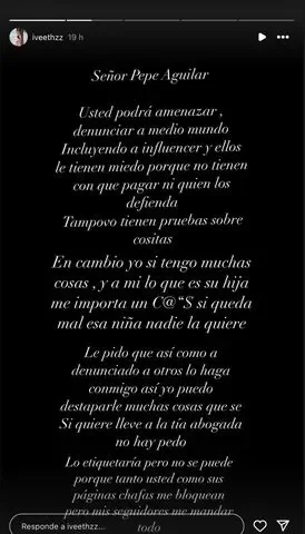 A pesar de las repetidas desmentidas por parte de la familia Aguilar, quienes han señalado que la joven busca atención para incrementar su número de seguidores, Iveethzz no ha dejado de insistir sobre su relación con Nodal. En sus más recientes publicaciones, incluso se dirigió a Pepe Aguilar, el padre de Ángela Aguilar, criticando su actitud hacia ella y afirmando que tiene información comprometedora sobre su hija.