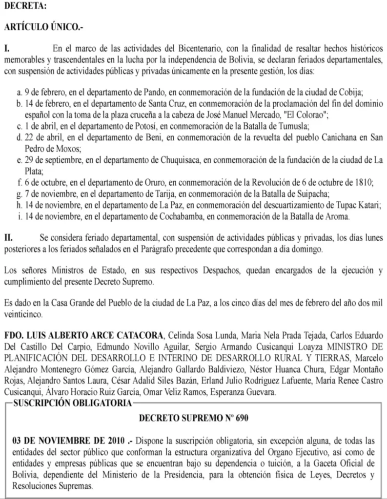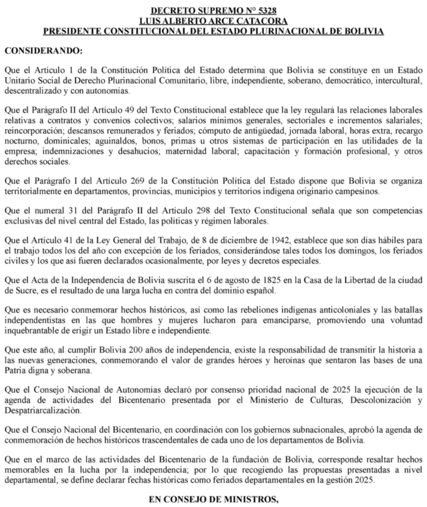 El decreto destaca que esta fecha conmemora la proclamación del fin del dominio español, cuando el 14 de febrero de 1825 se tomó la plaza cruceña bajo el liderazgo de José Manuel Mercado, conocido como «El Colorao». La norma especifica que este feriado será solo en la gestión 2025, como parte de los festejos por el Bicentenario de Bolivia, asignando un feriado adicional en cada departamento del país.