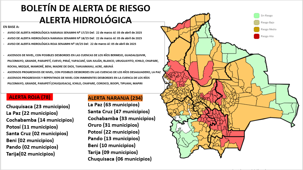 La Paz, 26 de marzo de 2025. – Ante los efectos devastadores de las lluvias y las inundaciones que afectan a todo el país, el presidente Luis Arce emitió un Decreto Supremo declarando emergencia nacional. En conferencia de prensa, explicó que las intensas precipitaciones, las cuales no se registraban en el país desde hace 40 años, han causado grandes daños en los nueve departamentos, afectando a más de 378,000 familias y dejando un saldo de 51 fallecidos.